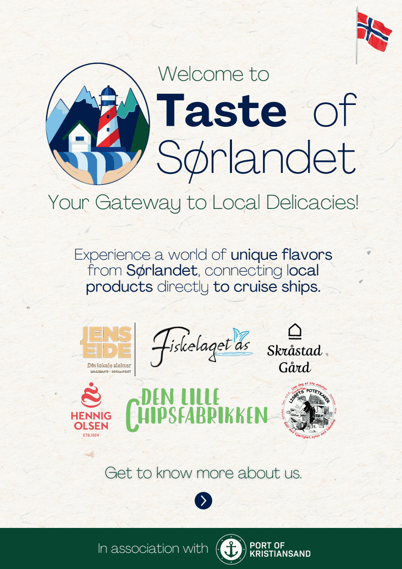 Fra Kristiansand stiller cruisemanager Fredrik Auestad og havnedirektør Atle Johannessen. De får også selskap av Marianne Pedersen fra Cruise Sørlandet. Dagen før avreise ble Auestad fotografert med brosjyren Tasting of Sørlandet, et tydelig tegn på at regionens unike mat- og kulturopplevelser skal løftes frem på den internasjonale scenen.